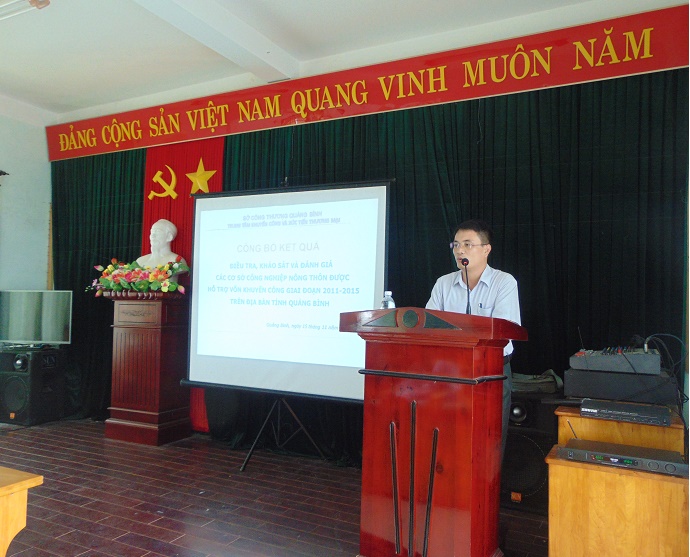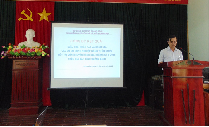 Ngày 15/11/2016, Trung tâm Khuyến công và Xúc tiến thương mại tỉnh Quảng Bình đã tổ chức Hội nghị Công bố kết quả điều tra, khảo sát và đánh giá các cơ sở công nghiệp nông thôn (CNNT) được hỗ trợ vốn Khuyến công giai đoạn 2011-2015, Tham dự lễ công bố có đ/c Nguyễn Song Hiển, Phó Giám đốc Sở cùng đại diện lãnh đạo và chuyên viên các phòng, ban, đơn vị trực thuộc Sở Công Thương Quảng Bình.