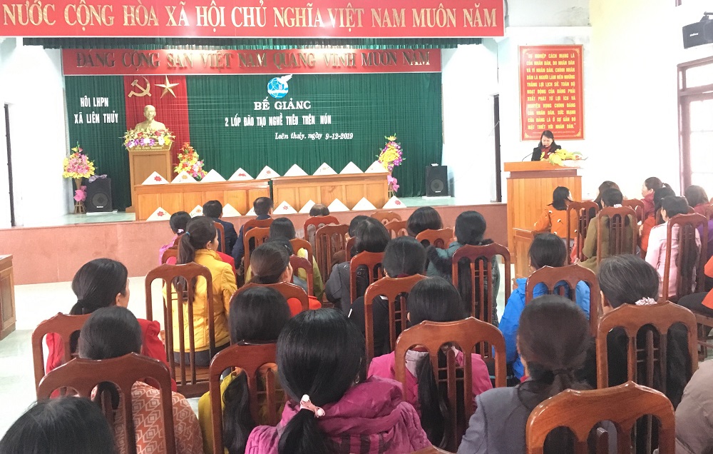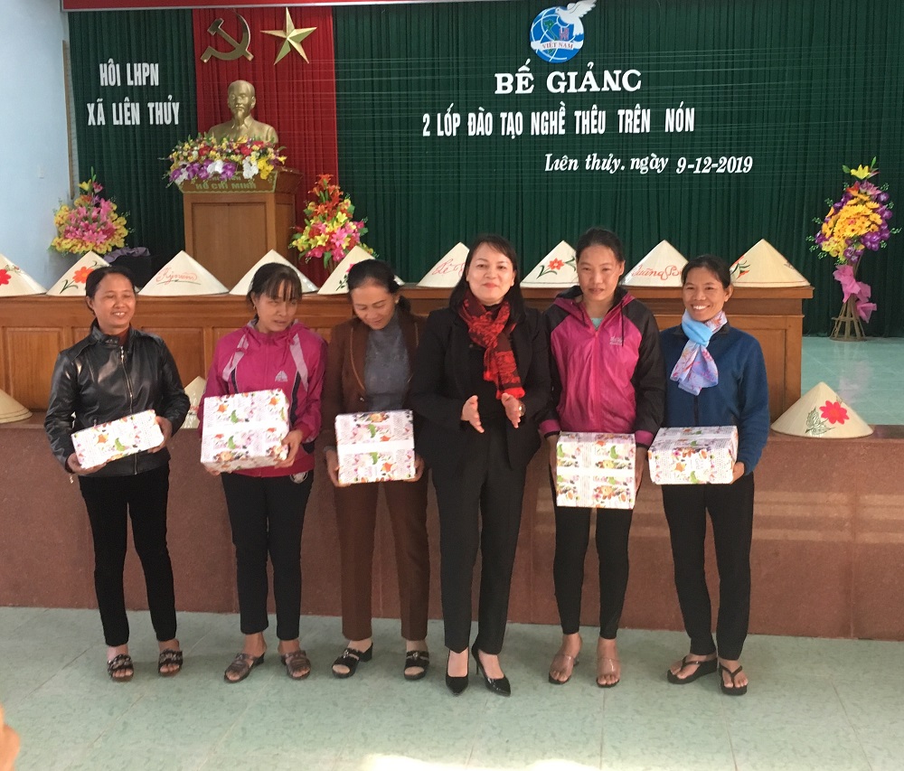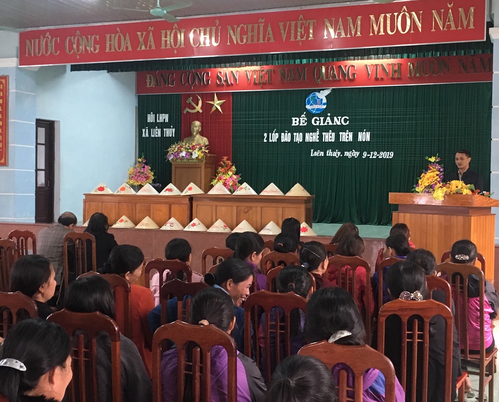Chiều ngày 09/12/2019, tại Hội trường Nhà văn hóa xã Liên Thủy, huyện Lệ Thủy, Hội Liên hiệp phụ nữ huyện Lệ Thủy tổ chức lễ bế giảng 02 lớp đào tạo nghề thêu ren trên nón cho các hội viên phụ nữ trên địa bàn xã Liên Thủy.