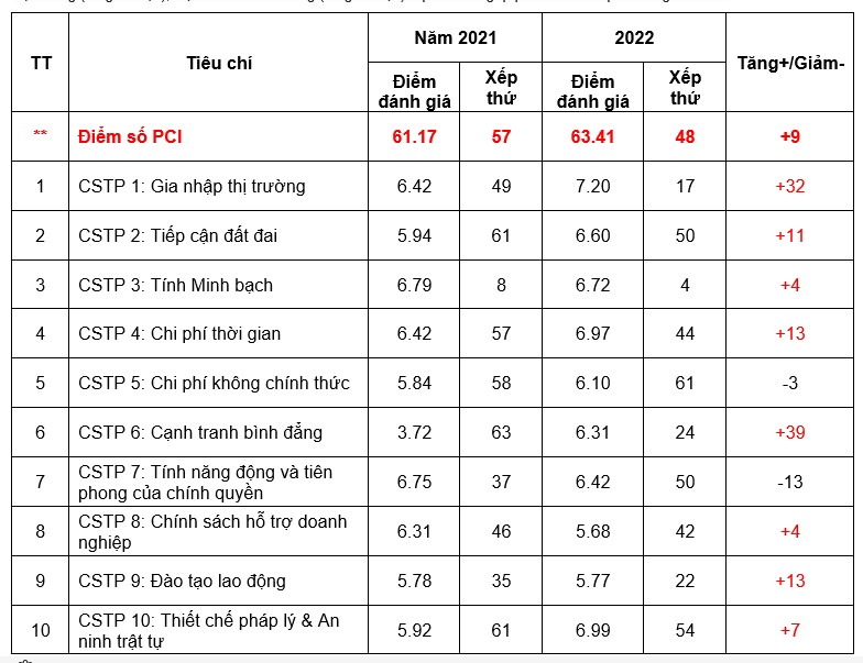 - Điểm đánh giá PCI năm 2022 tăng 2,24 điểm so với năm 2021; xếp thứ 48/63 tăng 9 bậc so với năm 2021 (xếp thứ 57/63);