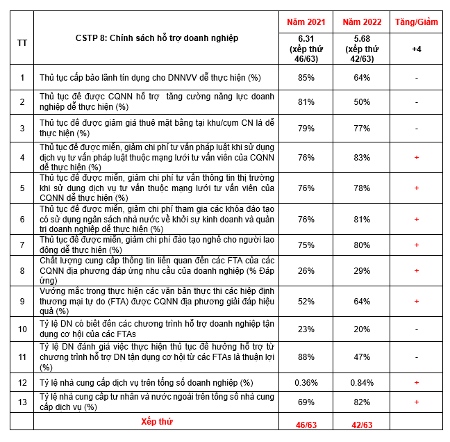 Đối Chỉ số thành phần “Chính sách hỗ trợ doanh nghiệp” do Sở Công Thương làm đầu mối triển khai thực hiện. Trong năm 2022, mặc dù có sự tăng trưởng về vị thứ xếp hạng (tăng 04 bậc) tuy nhiên kết quả chung vẫn còn hạn chế (xếp thứ 42/63), trong số 13 chỉ tiêu thành phần có 8/13 tăng trưởng dương và 5/13 bị giảm điểm; Bình quân chung mặc dù giảm 0,63 điểm tuy nhiên do đà giảm điểm chung của toàn quốc mà thứ hạng của chỉ số thành phần này lại có sự gia tăng.