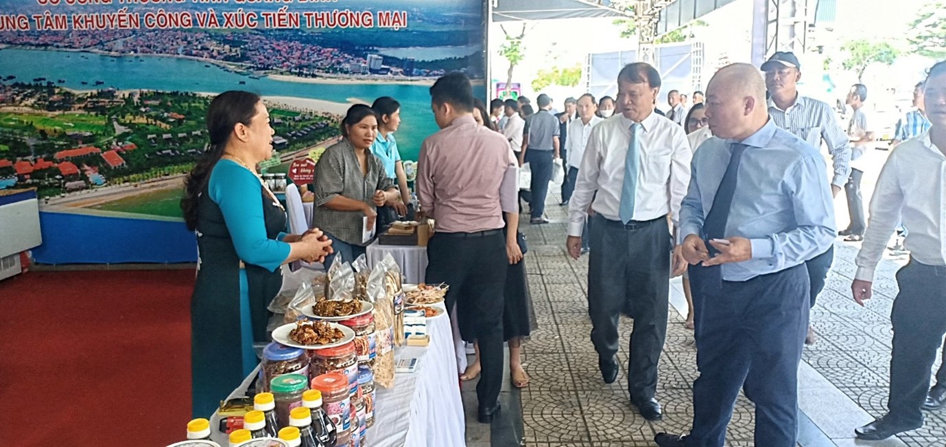 Lãnh đạo Sở Công Thương Quảng Bình, Trung tâm Khuyến công và Xúc tiến thương mại tham quan gian hàng trưng bày các sản phẩm của doanh nghiệp tỉnh Quảng Bình