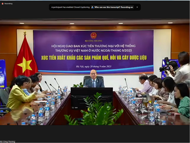 Ngày 28/9, tại Thủ đô Hà Nội, dưới sự chủ trì của đồng chí Vũ Bá Phú – Cục trưởng Cục Xúc tiến thương mại, đã diễn ra Hội nghị giao ban Xúc tiến thương mại với hệ thống Thương vụ Việt Nam ở nước ngoài tháng 9 năm 2023 với chủ đề: Xúc tiến xuất khẩu các sản phẩm Quế, Hồi và cây dược liệu.