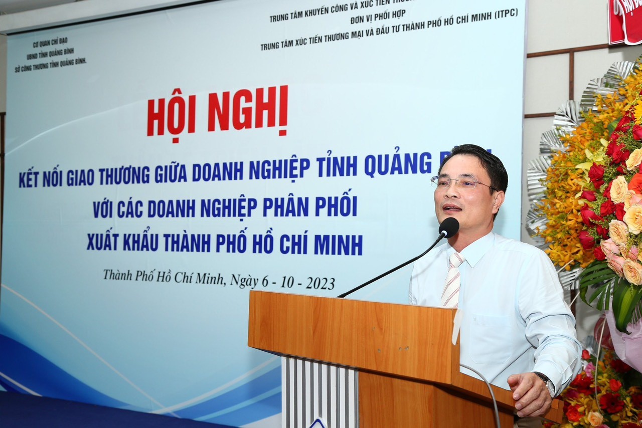 Phát biểu tại Hội nghị, ông Phan Hoài Nam – Phó Giám đốc Sở Công Thương Quảng Bình cho biết: Hội nghị là hoạt động thuộc Chương trình mục tiêu quốc gia xây dựng nông thôn mới năm 2023 trong lĩnh vực Công Thương, có ý nghĩa thiết thực cả về kinh tế, chính trị và xã hội nhằm tạo cơ hội giao lưu hợp tác kinh tế, kết nối giao thương tiêu thụ sản phẩm giữa tỉnh Quảng Bình và thành phố Hồ Chí Minh; Thông qua Hội nghị, mong muốn các sản phẩm đặc trưng tiêu biểu của các doanh nghiệp tỉnh Quảng Bình có thể kết nối giao thương, ký kết các biên bản ghi nhớ hợp tác kinh doanh, từ đó tiến tới ký kết hợp đồng tiêu thụ hàng hóa với các tập đoàn bán lẻ, doanh nghiệp phân phối, siêu thị, Sàn thương mại điện tử trên địa bàn thành phố Hồ Chí Minh và xa hơn nữa là tiến tới xuất khẩu.