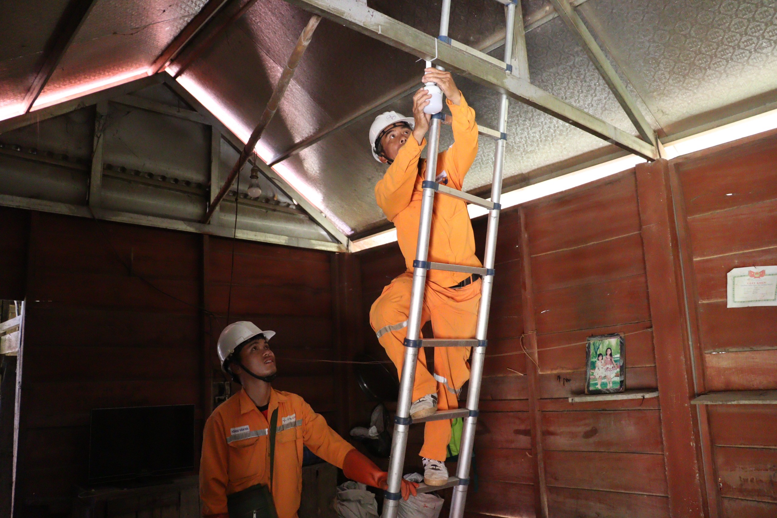 Hình ảnh công nhân Công ty điện lực Quảng Bình hỗ trợ lắp bóng điện cho đồng bào