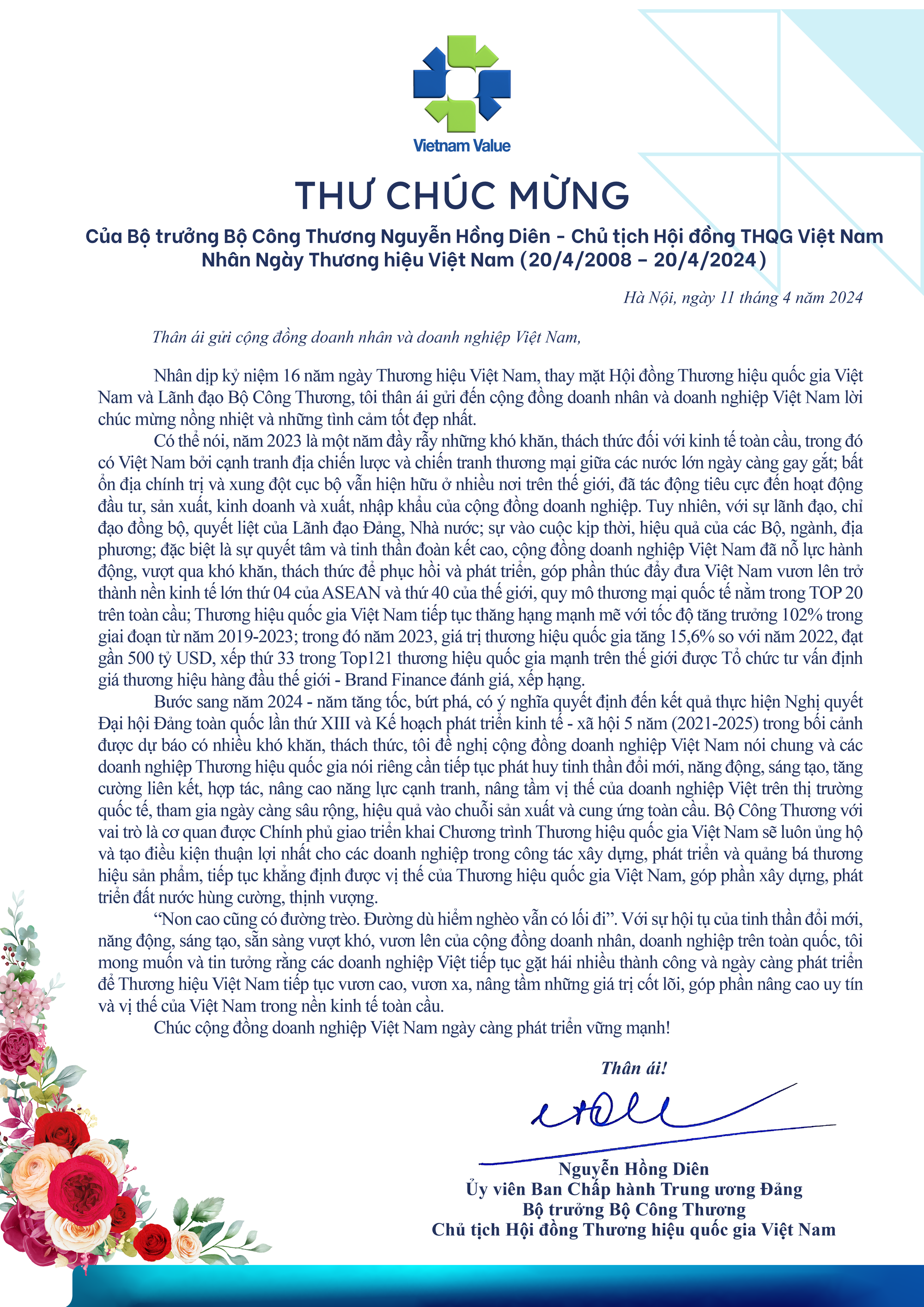 Nhân dịp kỷ niệm 16 năm ngày Thương hiệu Việt Nam (20/4/2008 - 20/4/2024), thay mặt Hội đồng Thương hiệu quốc gia Việt Nam, Ban cán sự đảng và Lãnh đạo Bộ Công Thương, Bộ trưởng Bộ Công Thương Nguyễn Hồng Diên thân ái gửi đến cộng đồng doanh nhân và doanh nghiệp Việt Nam lời chúc mừng nồng nhiệt và những tình cảm tốt đẹp nhất. Trang Thông tin điện tử Sở Công Thương Quảng Bình xin giới thiệu toàn văn thư chúc mừng của Bộ trưởng.