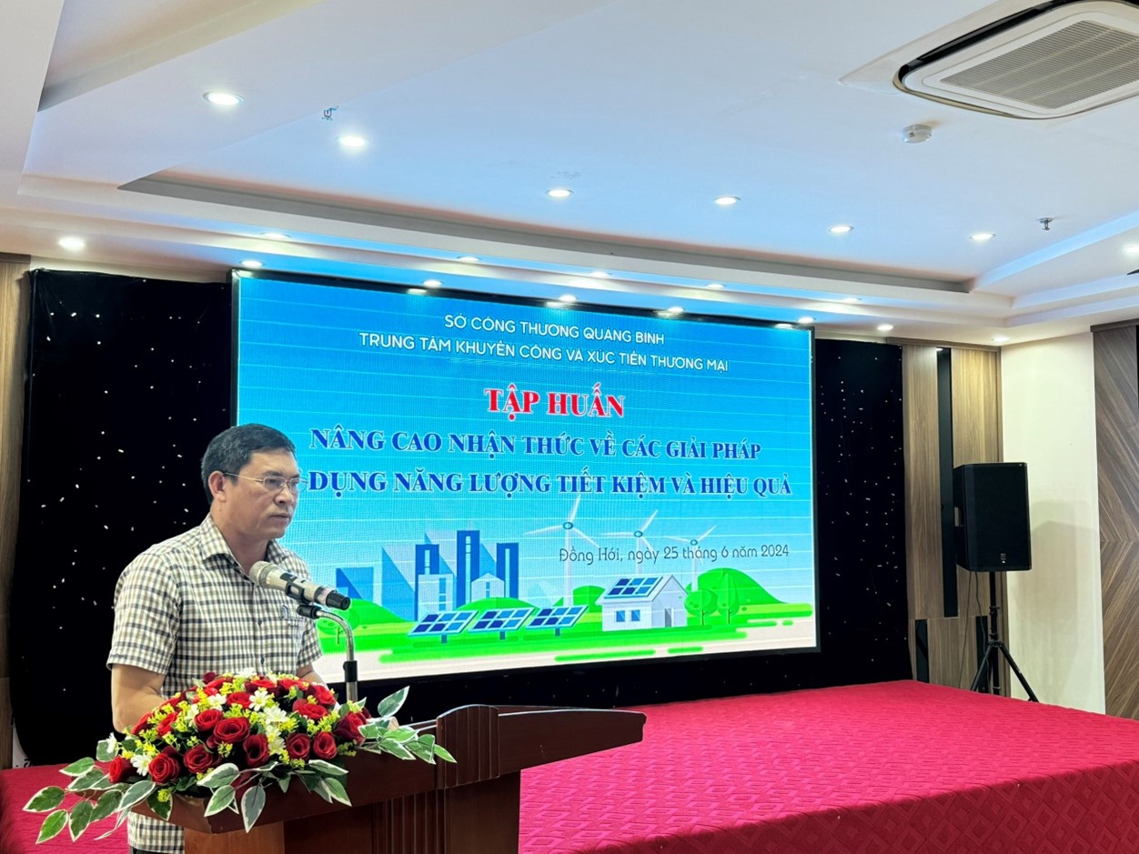 Ngày 25/6/2024, tại thành phố Đồng Hới, tỉnh Quảng Bình, Trung tâm Khuyến công và Xúc tiến thương mại tỉnh Quảng Bình đã tổ chức Hội nghị tập huấn “Nâng cao nhận thức về các giải pháp sử dụng năng lượng tiết kiệm và hiệu quả” cho các cán bộ quản lý nhà nước, các hiệp Hội; các doanh nghiệp, đơn vị sản xuất công nghiệp, tiểu thủ công nghiệp, thương mại và dịch vụ trên địa bàn tỉnh Quảng Bình. Tham dự hội nghị có Đồng chí Nguyễn Việt Hà - Phó Giám đốc Sở Công Thương; Đồng chí Lê Mậu Khánh - Giám đốc Trung tâm Khuyến công và Xúc tiến thương mại; Giảng viên Thạc sỹ Dương Chí Công - Giám đốc kỹ thuật Công ty cổ phần Giải pháp Công nghệ Việt Nam và 80 đại biểu đến từ các cơ quan quản lý nhà nước, đơn vị sự nghiệp, các hội và đại diện lãnh đạo các cơ sở sản xuất công nghiệp, tiểu thủ công nghiệp, thương mại và dịch vụ trên địa bàn tỉnh Quảng Bình.
