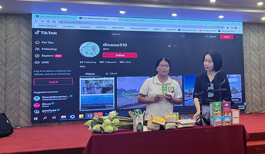 Học viên thực hành kỹ năng Livestream bán SP tại Tập huấn kỹ năng KD trên nền tảng số phát triển thương hiệu, xây dựng hình ảnh cho KTTT và HTX.