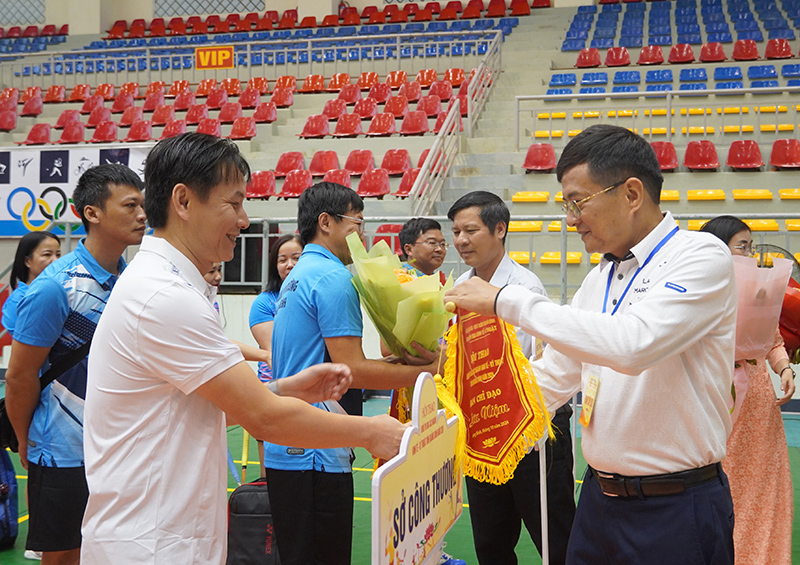 Ông Phạm Quang Hải, TUV Giám đốc Sở Công Thương – Trưởng Khối thi đua trao cờ lưu niệm cho các đoàn VĐV tham gia thi đấu
