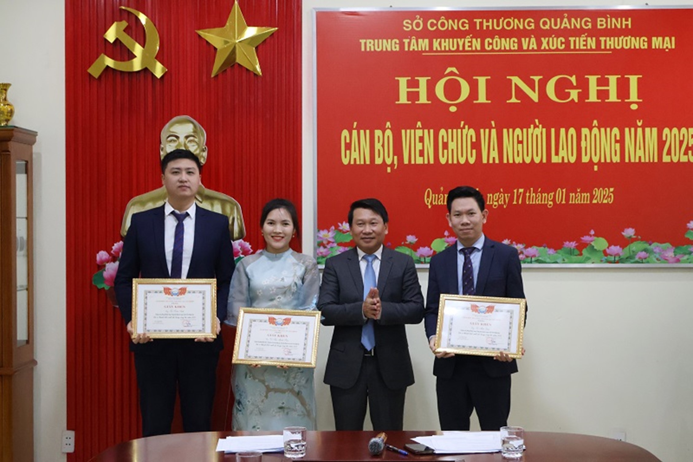 Tổng kết phong trào thi đua năm 2024, tập thể Trung tâm Khuyến công và Xúc tiến thương mại được Giám đốc Sở Công Thương tặng danh hiệu Tập thể lao động tiên tiến năm 2024; 01 cá nhân được Chủ tịch UBND tỉnh tặng Bằng khen; 02 cá nhân được Liên đoàn Lao động tỉnh Quảng Bình tặng Bằng khen; 01 cá nhân đạt danh hiệu chiến sỹ thi đua cấp cơ sở; 03 cá nhân được Giám đốc Sở Công Thương tặng Giấy khen và 100% cán bộ viên chức và người lao động đạt danh hiệu Lao động tiên tiến.