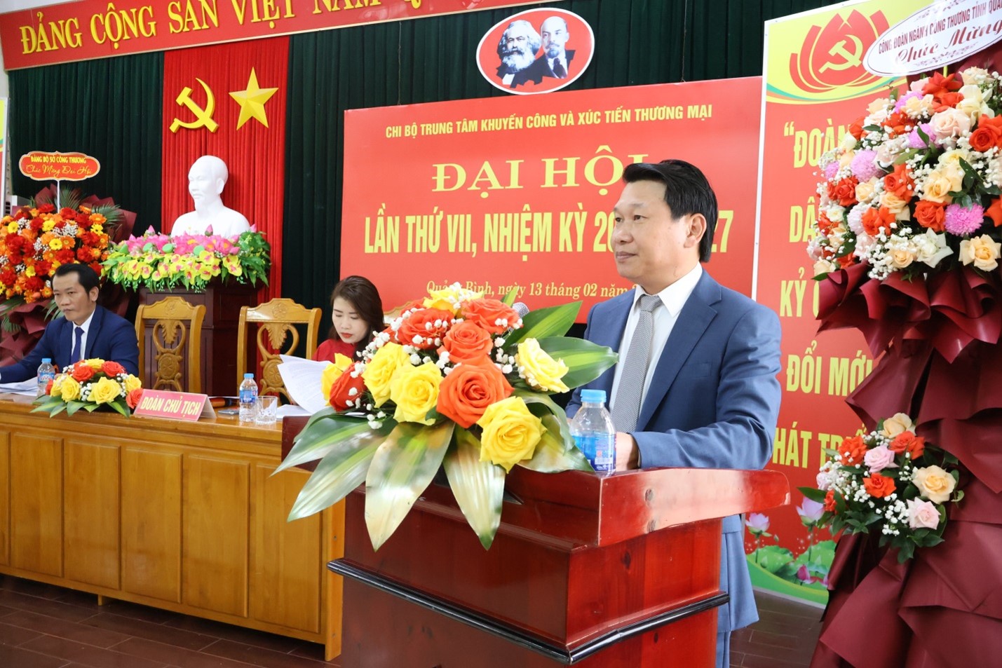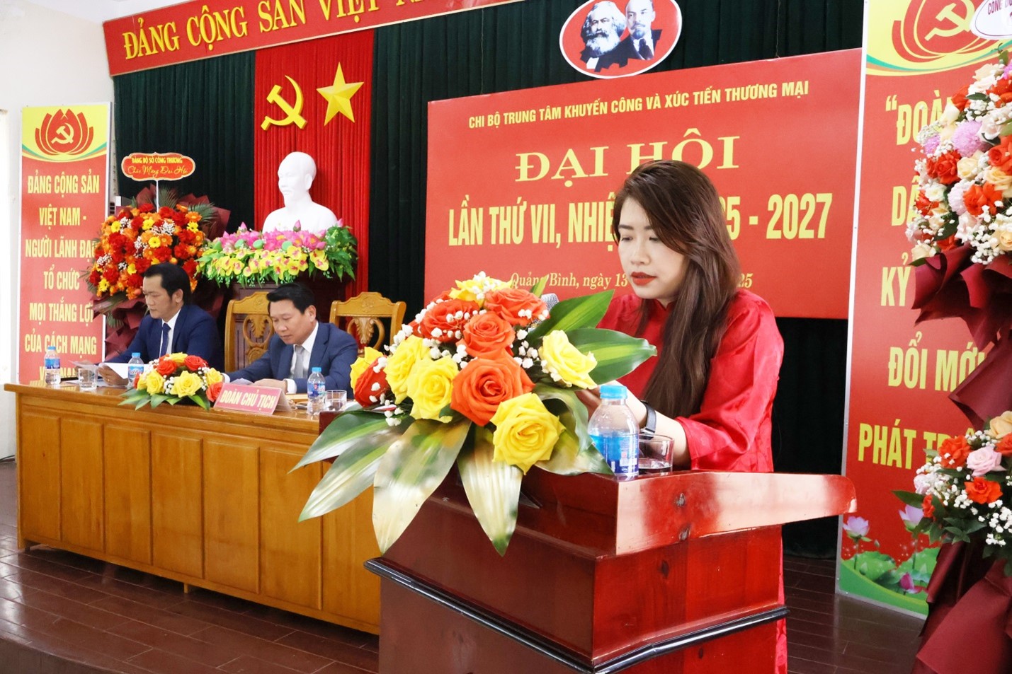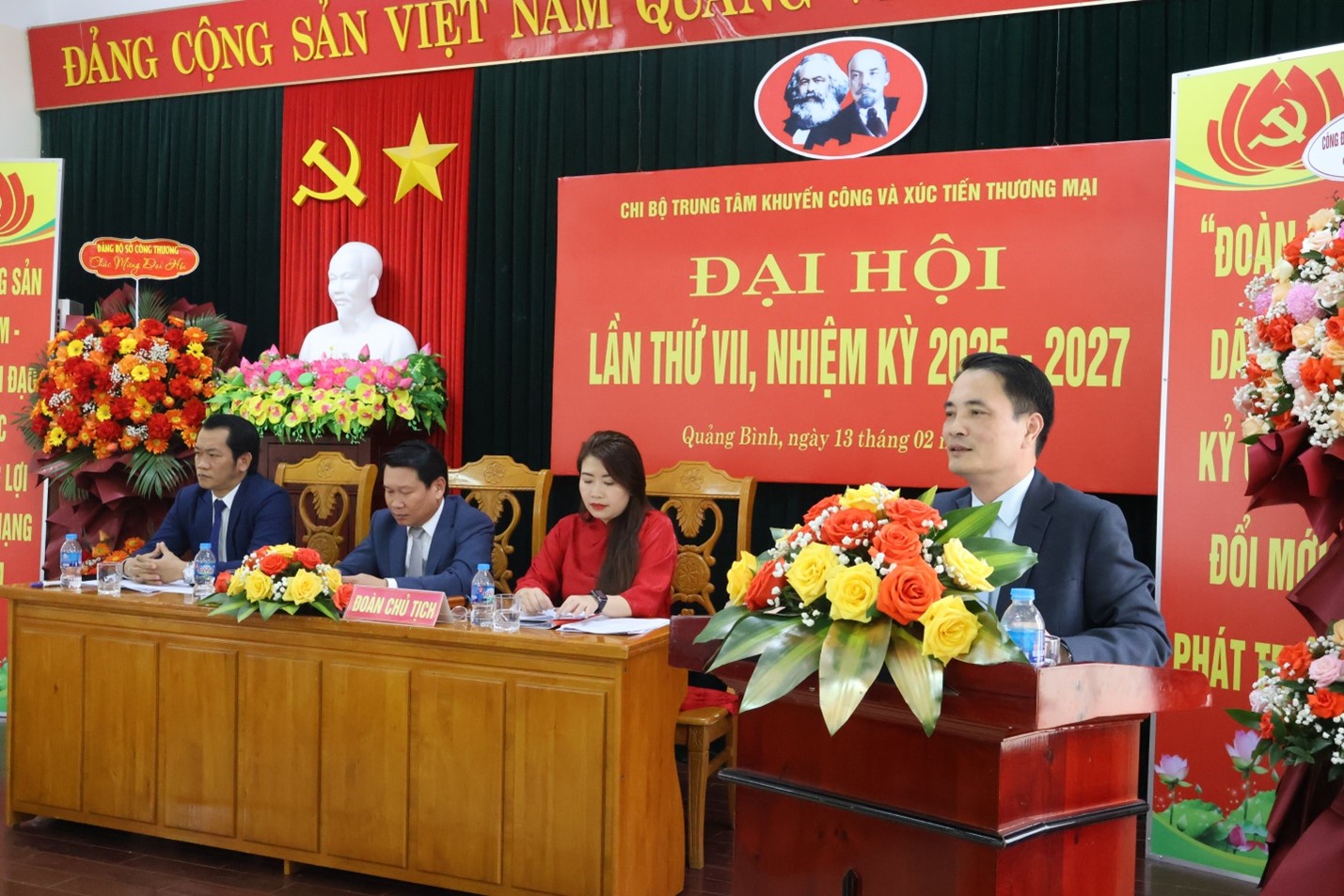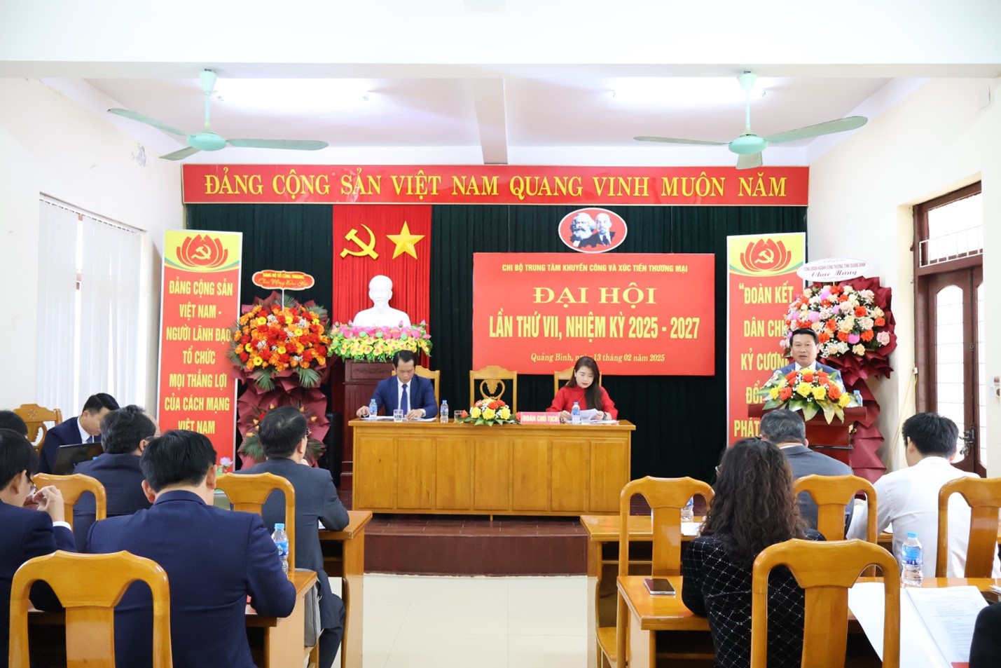 Chiều ngày 13/02/2025, Chi bộ Trung tâm Khuyến công và Xúc tiến thương mại đã tổ chức thành công Đại hội Chi bộ lần thứ VII, nhiệm kỳ 2025-2027. Đến dự và chỉ đạo Đại hội có đồng chí Phan Hoài Nam, Phó Bí thư, Phụ Trách Đảng ủy Sở Công Thương, Phó Giám đốc, Phụ trách Sở Công Thương; các đồng chí trong Ban Thường vụ, Ban Chấp hành Đảng bộ Sở Công Thương; tham dự Đại hội còn có Chủ tịch Công đoàn ngành Công Thương Quảng Bình, Bí thư Chi đoàn Sở Công Thương; Bí thư các Chi bộ trực thuộc Đảng bộ Sở Công Thương cùng toàn thể cán bộ đảng viên, cảm tình Đảng của Chi bộ.