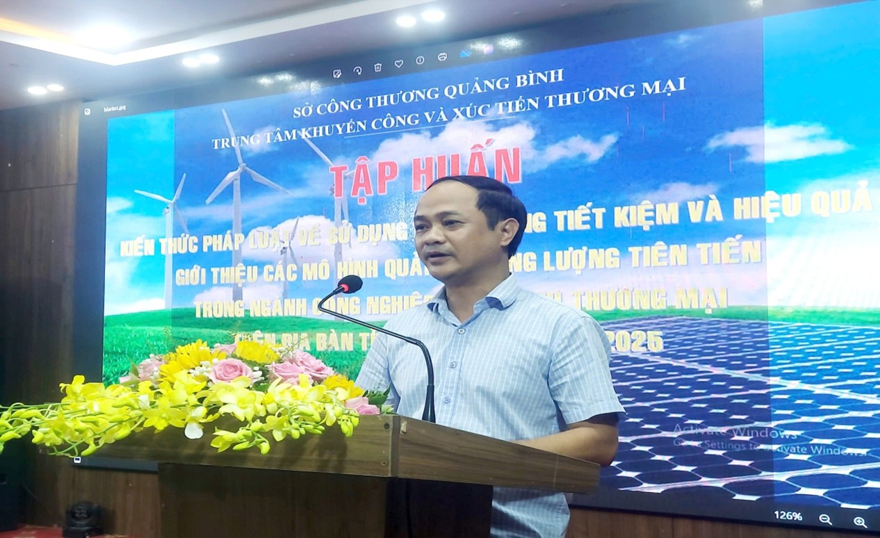 Ngày 18/6/2025, tại thành phố Đồng Hới, tỉnh Quảng Bình, Trung tâm Khuyến công và Xúc tiến thương mại tỉnh Quảng Bình đã tổ chức Hội nghị tập huấn “Kiến thức pháp luật về sử dụng năng lượng tiết kiệm và hiệu quả - Giới thiệu các mô hình quản lý năng lượng tiến tiến trong ngành công nghiệp và dịch vụ thương mại”. Tham dự hội nghị có Đồng chí Dương Văn Minh - Phó Giám đốc Trung tâm Khuyến công và Xúc tiến thương mại; Giảng viên Nguyễn Đình Tuấn Phong - Trường Đại học Điện lực và 75 đại biểu đại diện các cơ quan quản lý nhà nước trên địa bàn tỉnh; các doanh nghiệp, đơn vị sản xuất công nghiệp, tiểu thủ công nghiệp, các đơn vị thương mại và dịch vụ, các siêu thị, khách sạn lớn trên địa bàn tỉnh Quảng Bình; Báo Công Thương, Báo và Đài Phát thanh - Truyền hình Quảng Bình (dự và đưa tin).