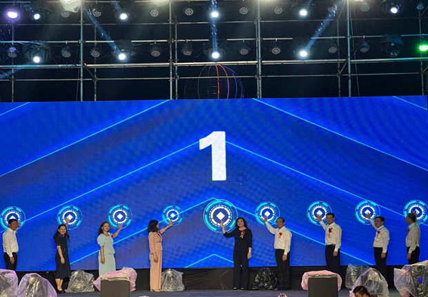 Các đại biểu thực hiện nghi thức ấn nút khai mạc Hội chợ triển lãm