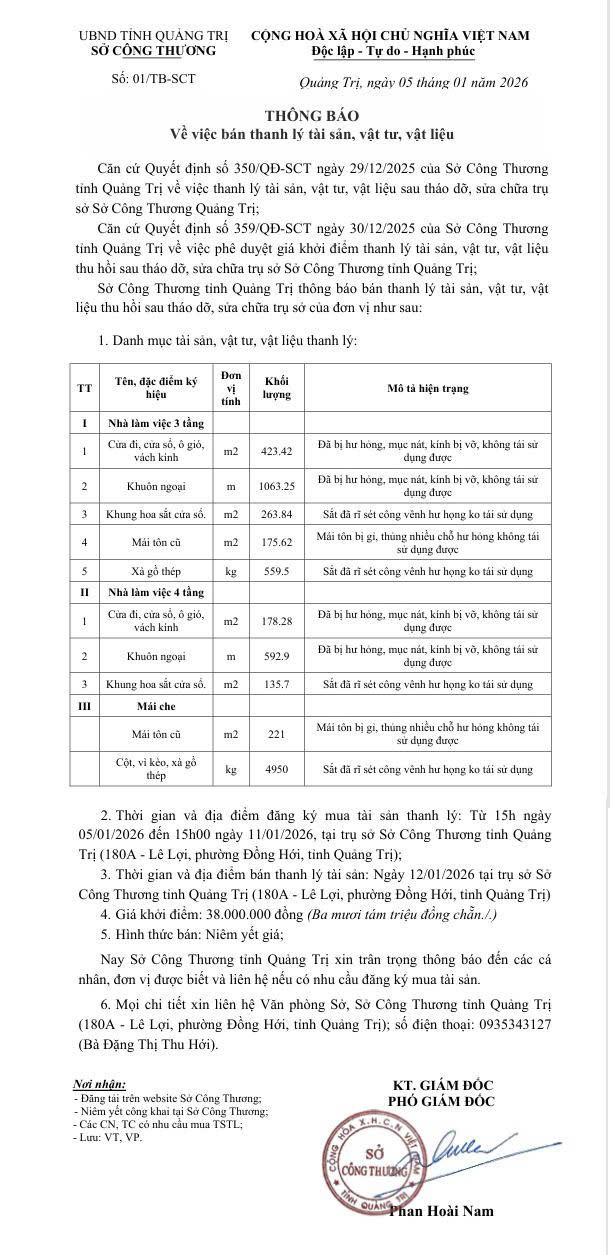 Ngày 05/01/2026, Sở Công Thương tỉnh Quảng Trị ban hành Thông báo số 01/TB-SCT thông báo về việc bán thanh lý tài sản, vật tư, vật liệu thu hồi sau tháo dỡ, sửa chữa trụ sở của đơn vị. Ban biên tập Trang thông tin điện tử Sở Công Thương xin thông báo để quý tổ chức/cá nhân biết tham gia.