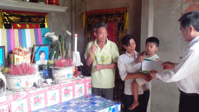 Được biết chị Hoàng Thị Thắm là công nhân may tại Công ty TNHH S&D Quảng Bình bị tai nan tử vong. Vào ngày 22/02/2016 chị cùng chồng là Nguyễn Viết Hùng và con trai Nguyễn Hoàng Hải trên đường về nhà thì không may gặp tai nạn giao thông. Hậu quả là hai vợ chồng chồng bị tử vong, cháu Nguyễn Hoàng Hải bị đa chấn thương nặng phải điều trị tại Bệnh viện Trung ương Huế. Gia đình chồng chị Thắm thuộc hộ cận nghèo, thu nhập chính chỉ trong chờ vào mấy sào ruộng, nay ông bà phải thay nhau vào chăm sóc cháu Hải. Đồng chí Phó Chủ tịch Liên đoàn Lao động tỉnh đã ân cần thăm hỏi, chia sẻ, động viên gia đình, đồng thời trao món quà hỗ trợ 03 triệu đồng cho gia đình. Số tiền hỗ trợ không lớn nhưng phần nào góp phần cùng gia đình chữa trị cho cháu Nguyễn Hoàng Hải.