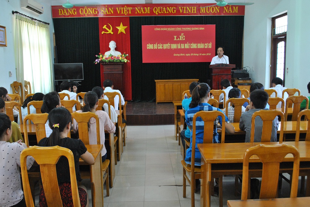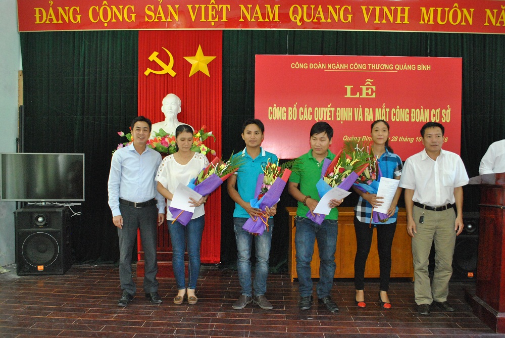 Ngày 28/10/2016, Công đoàn ngành Công Thương Quảng Bình đã tổ chức Lễ công bố các quyết định và ra mắt Công đoàn cơ sở, gồm: Công ty TNHH thương mại May Thăng Long, Công ty TNHH Nam Việt Quảng Bình, Công ty TNHH Thương mại và dịch vụ tổng hợp Trường Giang và Công ty TNHH sản xuất - thương mại xuất nhập khẩu Hoa Sen. Cùng các đồng chí Thường trực, Thường vụ Công đoàn ngành đã đến dự và chúc mừng.