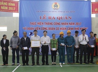 Với chủ đề “Vì đoàn viên Công đoàn có hoàn cảnh khó khăn”, Tháng Công nhân năm 2017 được diễn ra với khí thế sôi nổi trên tinh thần hướng về cơ sở, nhiều nội dung, hoạt động được triển khai sát thực với tình hình hoạt động của đoàn viên, người lao động như: phối hợp kiểm tra, giám sát việc thực hiện chính sách, pháp luật về tiền lương, tiền thưởng, thực hiện mức lương tối thiểu vùng và các chính sách BHXH, BHYT, BHTN; tham gia quản lý chất lượng, an toàn thực phẩm, giám sát việc cải thiện và nâng cao chất lượng bữa ăn ca cho người lao động; tổ chức đối thoại, tư vấn pháp luật cho CNLĐ, nhất là CNLĐ trong các doanh nghiệp ngoài quốc doanh và CNLĐ khu công nghiệp; tổ chức thăm hỏi, tặng quà, cho vay vốn, hỗ trợ “Mái ấm Công đoàn” cho đoàn viên có hoàn cảnh khó khăn; khởi công xây dựng công trình phúc lợi cho tập thể đoàn viên, người lao động; tập trung chỉ đạo thành lập 15 CĐCS; phát triển 500 đoàn viên công đoàn… Bên cạnh đó, các phong trào thi đua cũng được tập trung chỉ đạo thực hiện như phong trào “Đoàn viên, người lao động Quảng Bình thi đua làm theo lời Bác”, Chương trình “Công đoàn Quảng Bình đồng hành cùng học sinh vùng biển”; tiếp tục đẩy mạnh và thực hiện tốt phong trào thi đua “Lao động giỏi, lao động sáng tạo”, “Xanh - Sạch - Đẹp, bảo đảm ATVSLĐ”, “Giỏi việc nước, đảm việc nhà”, Cuộc vận động xây dựng người cán bộ, công chức, viên chức “Trung thành, sáng tạo, tận tuỵ, gương mẫu”, gắn với thực hiện tốt phong trào thi đua “ Dân vận khéo”…Tại Lễ phát động, Liên đoàn Lao động tỉnh Quảng Bình đã trích từ kinh phí hoạt động gần 2,5 tỷ đồng để hỗ trợ đoàn viên nghèo, có hoàn cảnh khó khăn, xây dựng nhà công vụ cho giáo viên vùng sâu, vùng khó khăn. Trong đó hỗ trợ 100 đoàn viên vay vốn để phát triển kinh tế gia đình; hỗ trợ xây dựng, chữa chữa 29 nhà “Mái ấm công đoàn"; hỗ trợ để thăm hỏi, tặng quà cho 100 đoàn viên, lao động nghèo, có hoàn cảnh khó khăn, CNLĐ bị tai nạn lao động, bị bệnh nghề nghiệp; hỗ trợ 02 nhà công vụ giáo viên.