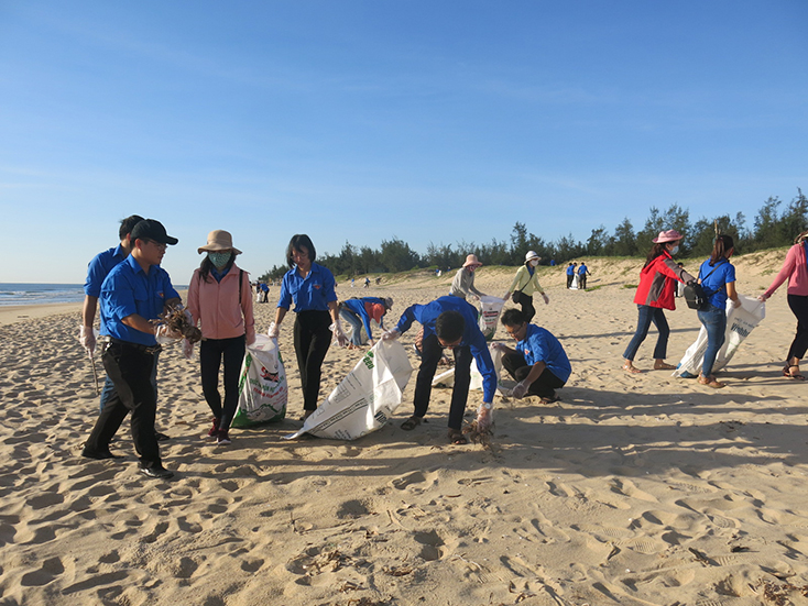 Các ĐVTN Đoàn Khối các cơ quan tỉnh dọn vệ sinh tại bãi biển Quang Phú, TP. Đồng Hới