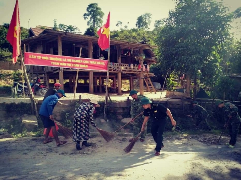 Cán bộ, chiến sỹ Đồn Biên phòng Ra Mai và đoàn viên thanh niên trên địa bàn tham gia dọn vệ sinh môi trường hưởng ứng "Ngày chủ nhật xanh"