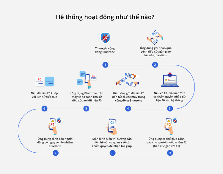 - Ứng dụng Bluezone ghi nhận những người tiếp xúc gần trong khoảng 2m, nếu một người trong mạng lưới tiếp xúc gần bị phát hiện lây nhiễm thì phần mềm sẽ chỉ ra những người tiếp xúc gần còn lại, giúp cho việc truy vết, khoanh vùng dập dịch nhanh chóng.