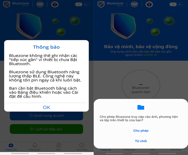 Bên cạnh đó ứng dụng cũng sẽ yêu cầu cho phép truy cập vị trí và truy cập một số thông tin của người dùng (việc cho phép truy cập này không sợ bị mất thông tin dữ liệu vì ứng dụng không thu thập những thông tin này) để nếu người bạn tiếp xúc hoặc có bất kỳ ca nhiễm mới nào nhiễm Covid-19, ứng dụng sẽ ngay lập tức gửi thông tin đến bạn.