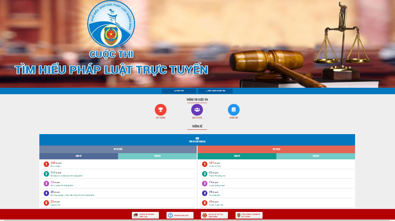 Cuộc thi được tổ chức công khai, rộng rãi trong phạm vi tỉnh Quảng Bình, dưới hình thức thi trực tuyến trên Trang thông tin điện tử Sở Tư pháp Quảng Bình tại địa chỉ https://stp.quangbinh.gov.vn/3cms/ hoặc truy cập vào địa chỉ trực tiếp của Cuộc thi http://timhieuphapluat.quangbinh.gov.vn.