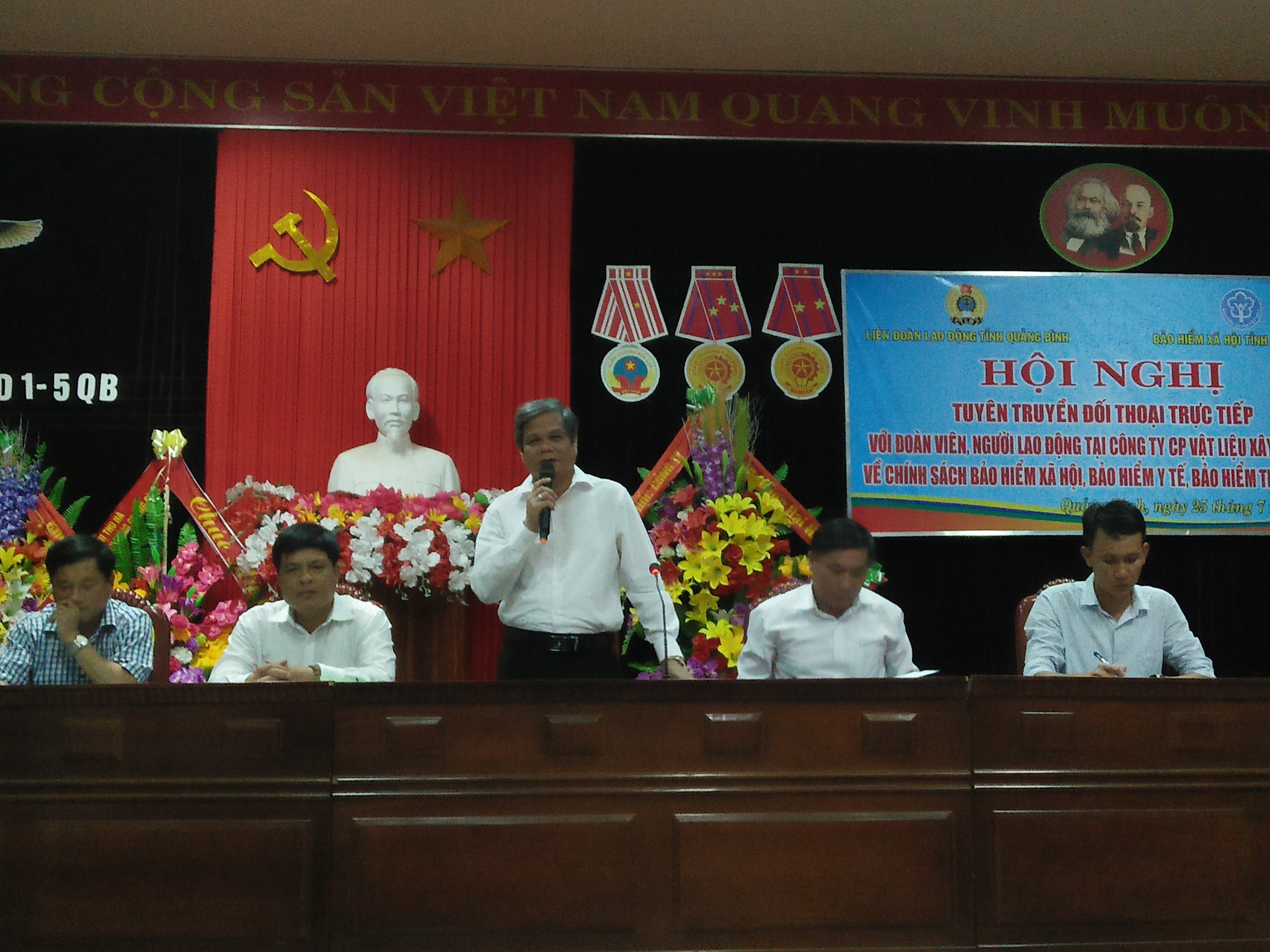 Đêm 25.7.2018, Công đoàn ngành Công Thương Quảng Bình cùng với Trung tâm Tư vấn pháp luật Liên đoàn Lao động tỉnh đã phối hợp với Bảo hiểm xã hội tỉnh Quảng Bình đã tổ chức hội nghị đối thoại về chính sách BHXH, BHYT, Bảo hiểm thất nghiệp tại Công ty cổ phần Vật liệu Xây dựng 1.5. Đồng chí Nguyễn Xuân Toàn - Phó Chủ tịch LĐLĐ tỉnh; đồng chí Phạm Văn Vẻ - Phó Giám đốc BHXH tỉnh đến dự và đối thoại với người lao động.
