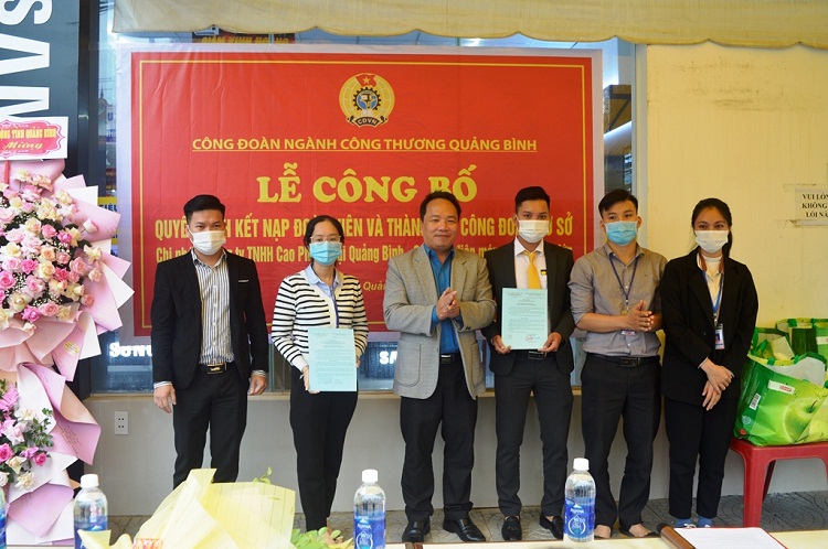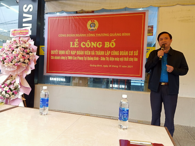 Tại buổi lễ, đại diện Ban Thường vụ Công đoàn ngành Công Thương đã công bố quyết định thành lập mới CĐCS Công ty TNHH Cao Phong tại Quảng Bình – Siêu thị điện máy và nội thất Chợ Lớn với 42 đoàn viên Công đoàn.