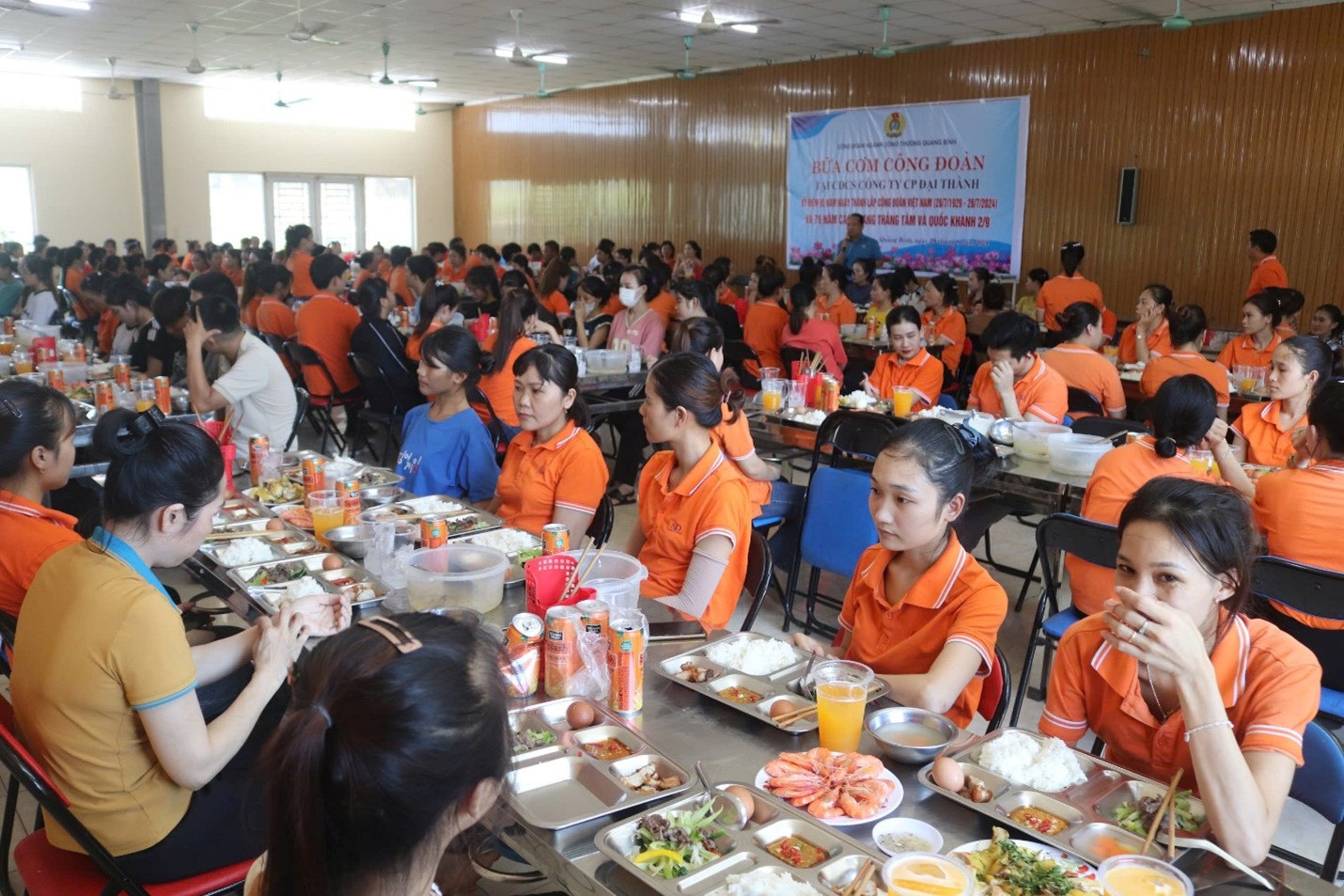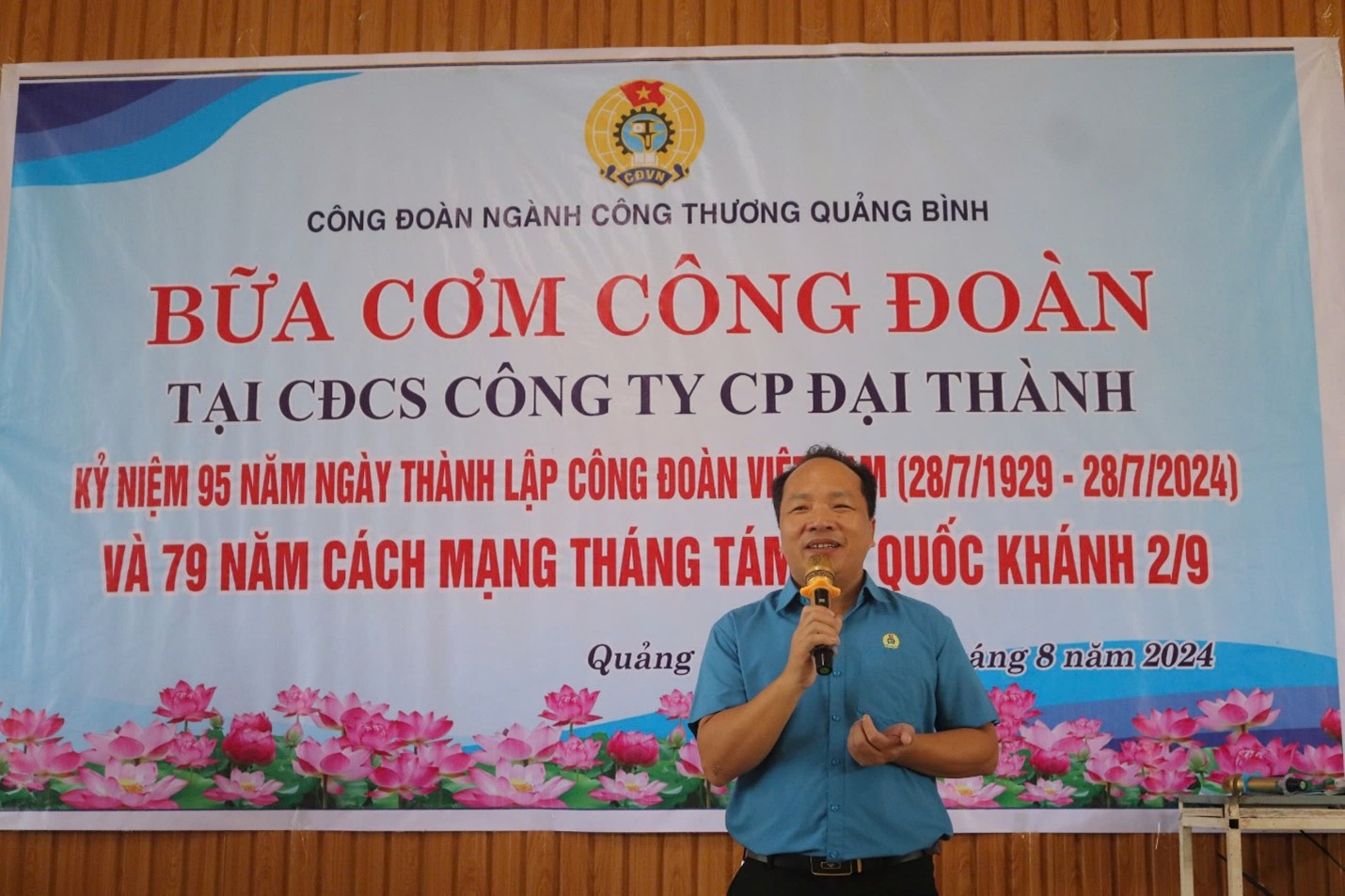 Trưa ngày 29.8.2024 tại Công ty Cổ phần Đại Thành nhân kỷ niệm 95 năm thành lập Công đoàn Việt Nam, 79 năm cách mạng tháng 8 và quốc khánh 2/9, Công đoàn ngành đã phối hợp với Công ty tổ chức “Bữa cơm Công đoàn” cho người lao động. Dự cùng chương trình có đồng chí Phan Mạnh Hùng, Chủ tịch Công đoàn ngành; đồng chí Mai Hải Vân, Giám đốc điều hành Công ty; đồng chí Võ Xuân Hạnh, Phó Ban Tuyên giáo - Nữ công LĐLĐ tỉnh; đồng chí Lê Minh Phương – Trưởng phòng khuyến công - Trung tâm khuyến công và xúc tiến thương mại QB và 210 đoàn viên, CNLĐ.