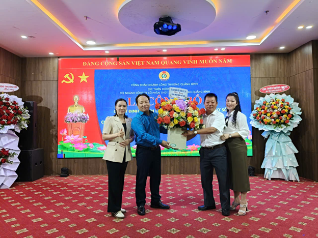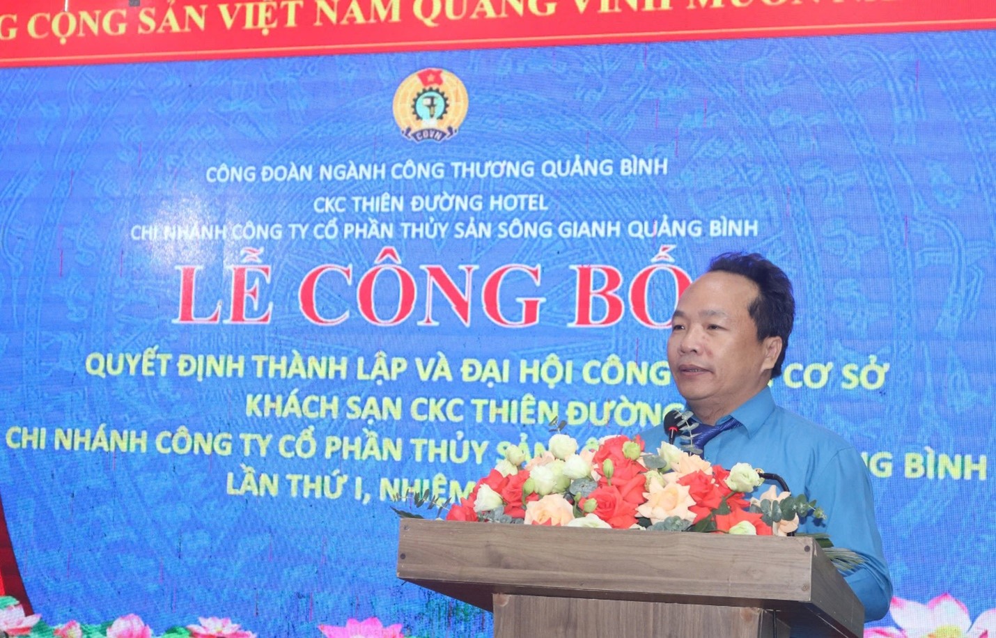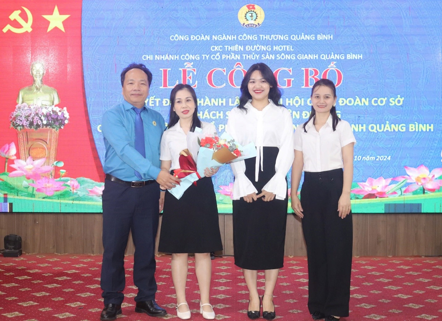 Tại buổi lễ, đại diện Ban Thường vụ Công đoàn ngành Công Thương đã công bố quyết định thành lập mới CĐCS Khánh sạn CKC, Thiên Đường, Chi nhánh Công ty cổ phần Thủy sản Sông Gianh với 27 đoàn viên Công đoàn.